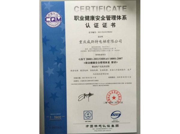职业健康安全管理体系认证证书
